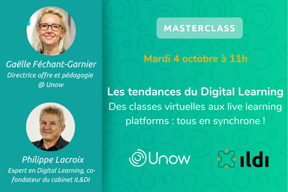 Pour faire le point sur les tendances du Digital Learning et plus particulièrement sur le sujet des classes virtuelles, Unow vous propose une Masterclass exceptionnelle mardi 4 octobre à 11h.