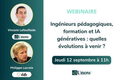 À l’occasion de la sortie de nos formations « S’appuyer sur les IA génératives pour concevoir, animer et évaluer ses formations » et "IA & Pédagogie pour les formateurs", Unow vous propose un nouveau webinaire dédié.