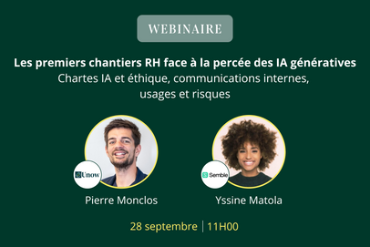 Rejoignez-nous le jeudi 28 septembre à 11h pour un webinaire sur les premiers chantiers RH face à la percée des IA génératives. Il sera animé par Pierre Monclos, DRH & Expert en Digital Learning chez Unow et Yssine Matola, VP of People chez Semble.