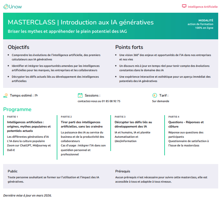 Vous avez un projet de formation en IA générative ? Unow vous accompagne avec des dispositifs sur mesure, adaptés à vos métiers et à vos enjeux. Parlons-en.