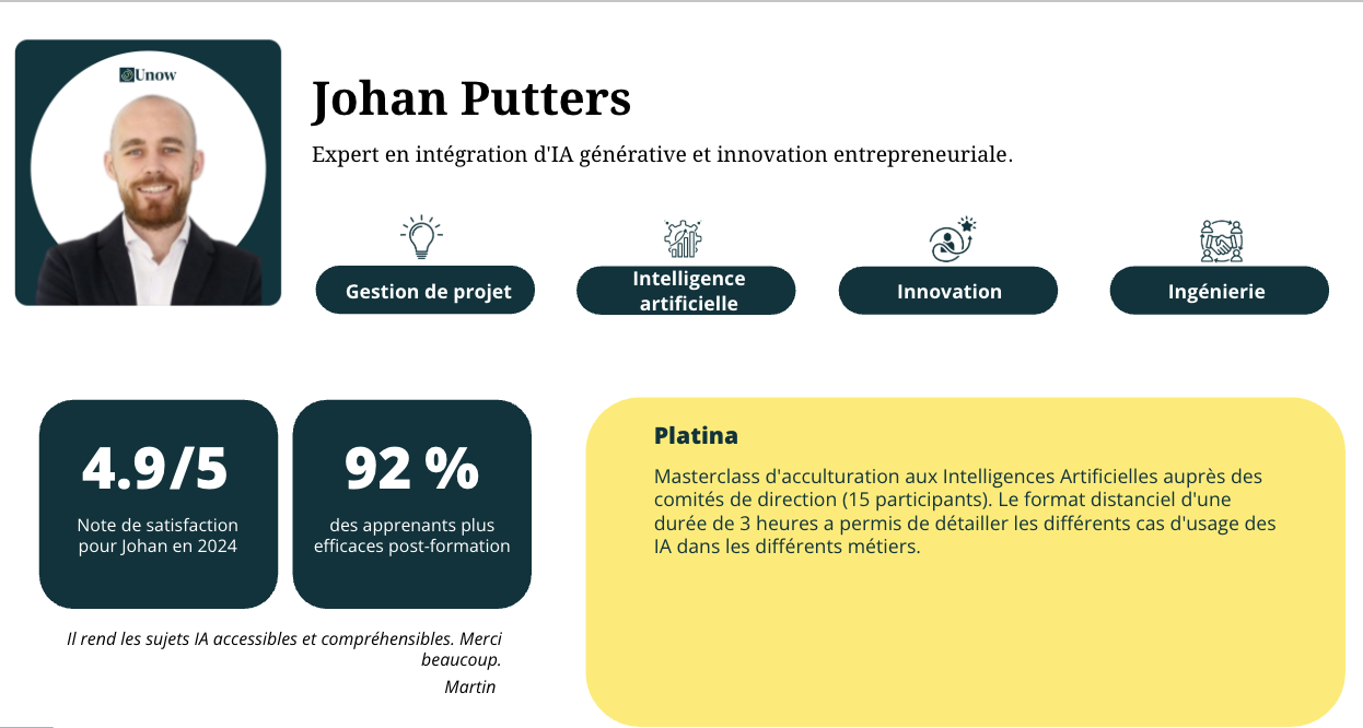 Nicolas Colombini raconte : « Les formateurs sont vraiment entrés dans notre contexte. Ils ont préparé leurs démos directement dans notre environnement et partagé des prompts personnalisés en fin de session ».